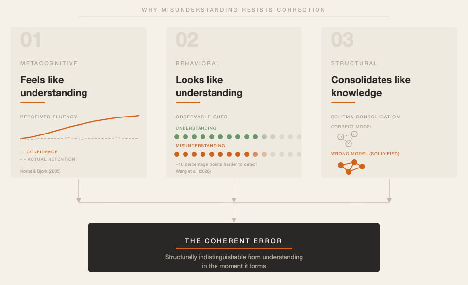 The first is metacognitive: misunderstanding feels like understanding. Koriat and Bjork (2005) showed that judgments of learning are driven by the fluency of processing rather than by actual retention. When information feels easy to take in, learners rate it as well-understood, even when later recall reveals otherwise. Misunderstanding produces exactly this fluency. The wrong model generates smooth processing because it is already there, already connected to other beliefs, already generating predictions. The learner does not experience friction because their model handles the input without conflict. Dunlosky et al. (2013) confirmed in a wide-ranging review that learners systematically overestimate how well they have understood material, particularly when they have used passive methods that generate fluency without requiring retrieval.